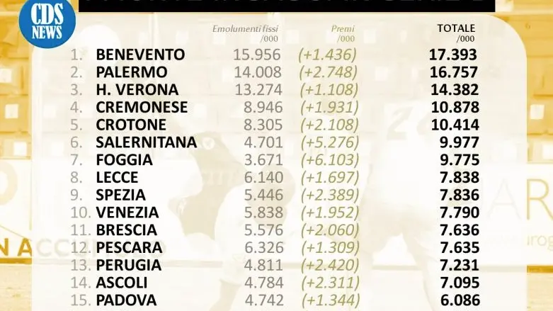 Guardando alle neopromosse dalla C, chi ha investito maggiormente è il Lecce (6milioni 140mila euro di fisso più 1milioni e 697mila euro di premi), poi a ruota Padova (4milioni 742mila euro più 1milione 344mila euro), Livorno (4milioni 137mila euro più 1milione 225mila euro) e appunto Cosenza.