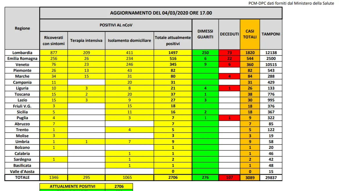 Nuovo aggiornamento della Protezione Civile sull’emergenza coronavirus in Italia. Aumentano i casi nelle regioni più colpite, ma anche nelle altre la situazione non migliora. In Calabria un altro caso sospetto che nella tabella non troverete perché si attende la conferma dell’Istituto Superiore di Sanità. 3089 le persone che hanno contratto il virus, 107 deceduti e 276 guariti. Tra i 2706