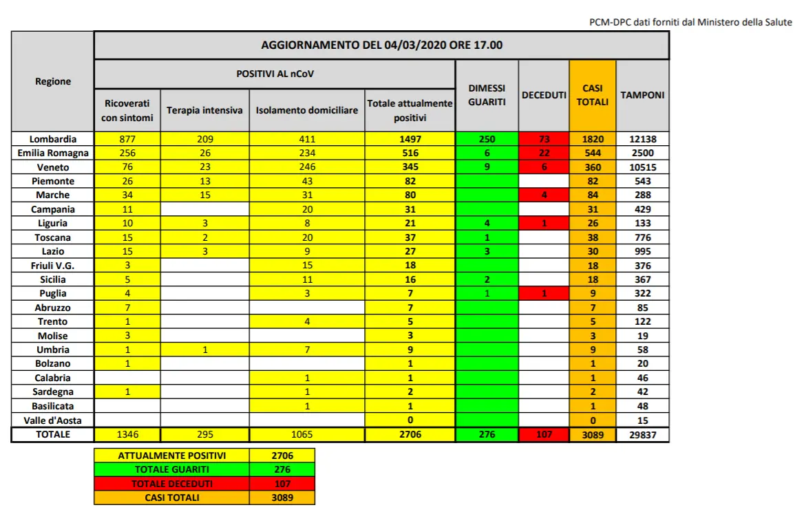 - 3089 le persone che hanno contratto il virus, 107 deceduti e 276 guariti.