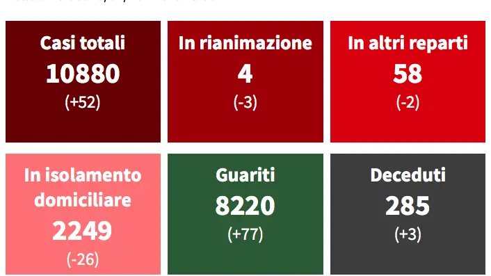 Dall’inizio dell’epidemia da coronavirus ad oggi sono 1.454 i positivi tra 0-18 anni colpiti dal virus; 4.830 quelli tra 19-50 anni (con 4 decessi); 3.148 tra 51-70 anni (con 67 decessi); 1.448 dai 70 anni in su (con 214 decessi). Ad oggi sono 5.333 i maschi infettati dal virus, mentre le femmine sono 5.547. Per quanto riguarda i decessi, 155 tra i maschi e 130 tra le femmine.
