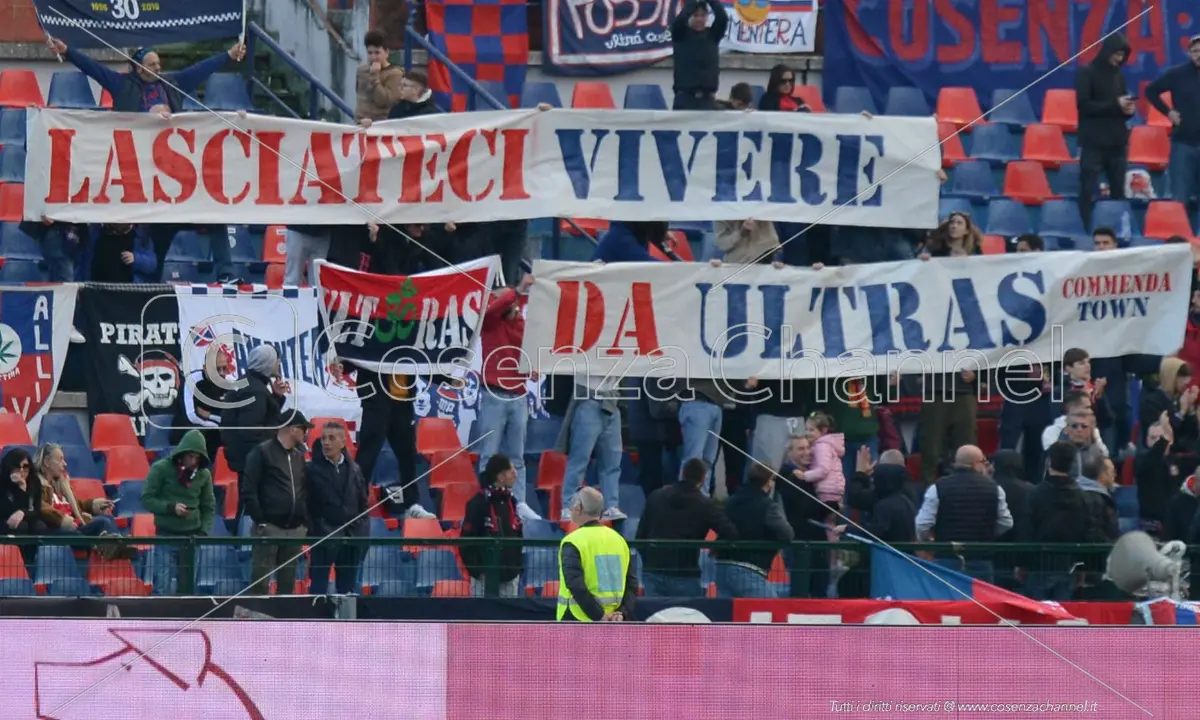 Al 16’ i supporter rossoblù sono tornati al proprio posto non rinunciando alle invettive verso Guarascio e chiedendo a gran voce di «liberare il Cosenza». Il resto dello stadio ha applaudito, segno che l’appeal del numero uno del club è nuovamente ai minimi storici. In Curva Nord, durante tutta la partita, sono stati esposti gli striscioni “Il Cosenza è del suo popolo” e “Ultras… liberi di esserlo”. Eloquenti.