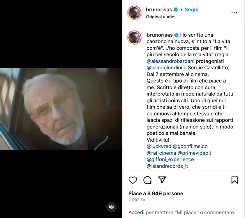 Il cantautore cosentino Dario Brunori ha annunciato sulla propria pagina Instagram di aver firmato la colonna sonora dell’ultimo film interpretato da Sergio Castellitto e diretto da Alessandro Bardani. Il brano che s’intitola “La vita com’è” è la colonna sonora della pellicola “Il più bel secolo della mia vita” che uscirà nelle sale il prossimo 7 settembre. «Questo è il tipo di film che piace a me. Scritto e diretto con cura, interpretato in modo naturale da tutti gli artisti coinvolti. Uno di quei rari film che sa di vero, che sorridi e ti commuovi al tempo stesso e che lascia spazi di riflessione sui rapporti generazionali, in modo poetico e mai banale».