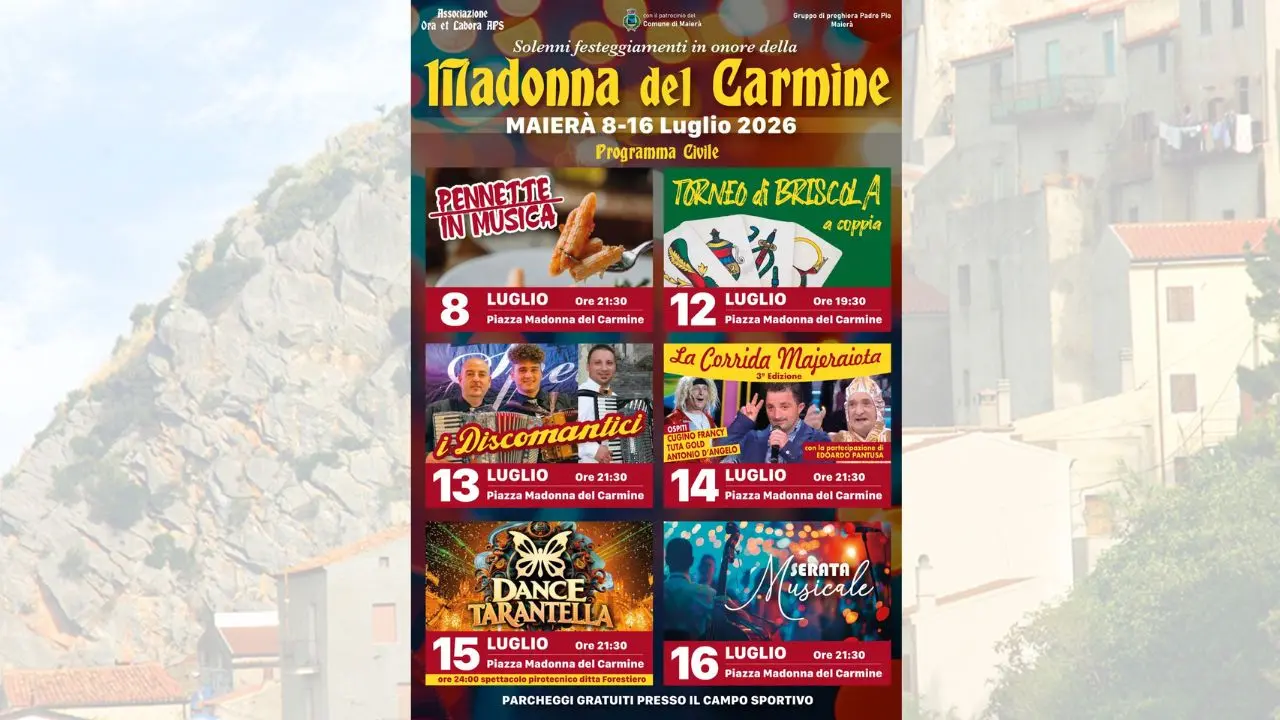 Il borgo di Maierà rinnova il suo profondo legame con la storia e l’identità locale in occasione dei solenni festeggiamenti in onore della Madonna del Carmine, un evento che si conferma pilastro fondamentale della tradizione comunitaria e cuore pulsante dell’estate locale. Dall’8 al 16 luglio 2026, il Programma Civile curato dall’Associazione Ora et Labora APS — con il patrocinio del Comune di Maierà e la collaborazione del Gruppo di Preghiera Padre Pio — offrirà un calendario ricco di appuntamenti che spaziano dalla gastronomia allo spettacolo popolare.