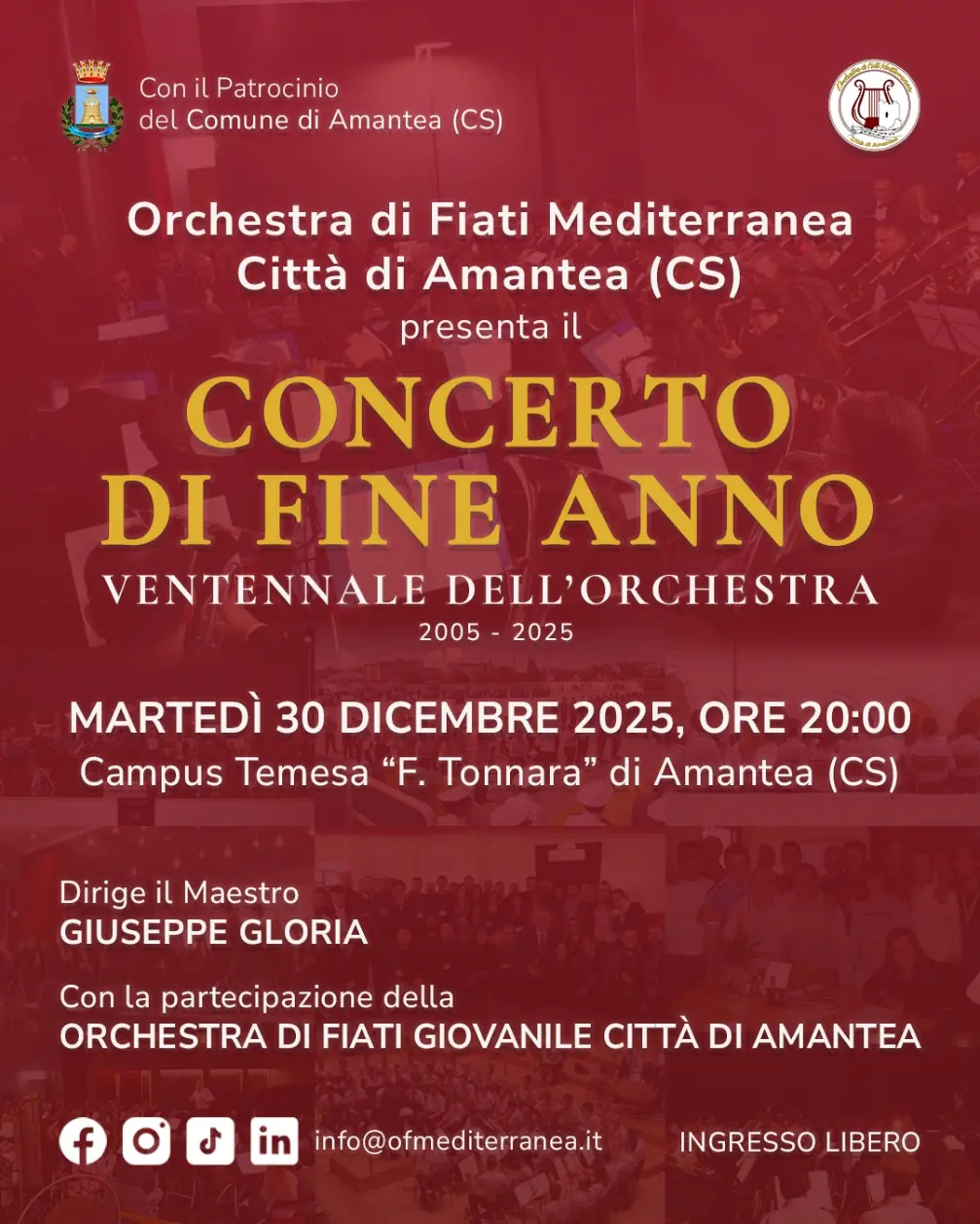 Venti anni non sono solo una ricorrenza cronologica. Per l'Orchestra di Fiati Mediterranea Città di Amantea (OFM), rappresentano la misura di un sogno trasformatosi in un’eccellenza di caratura internazionale. Il prossimo Martedì 30 Dicembre 2025, alle ore 20:00, l’Auditorium del Campus Temesa “F. Tonnara” ospiterà l’evento più atteso della stagione concertistica: la celebrazione del XX Anniversario di fondazione del sodalizio.