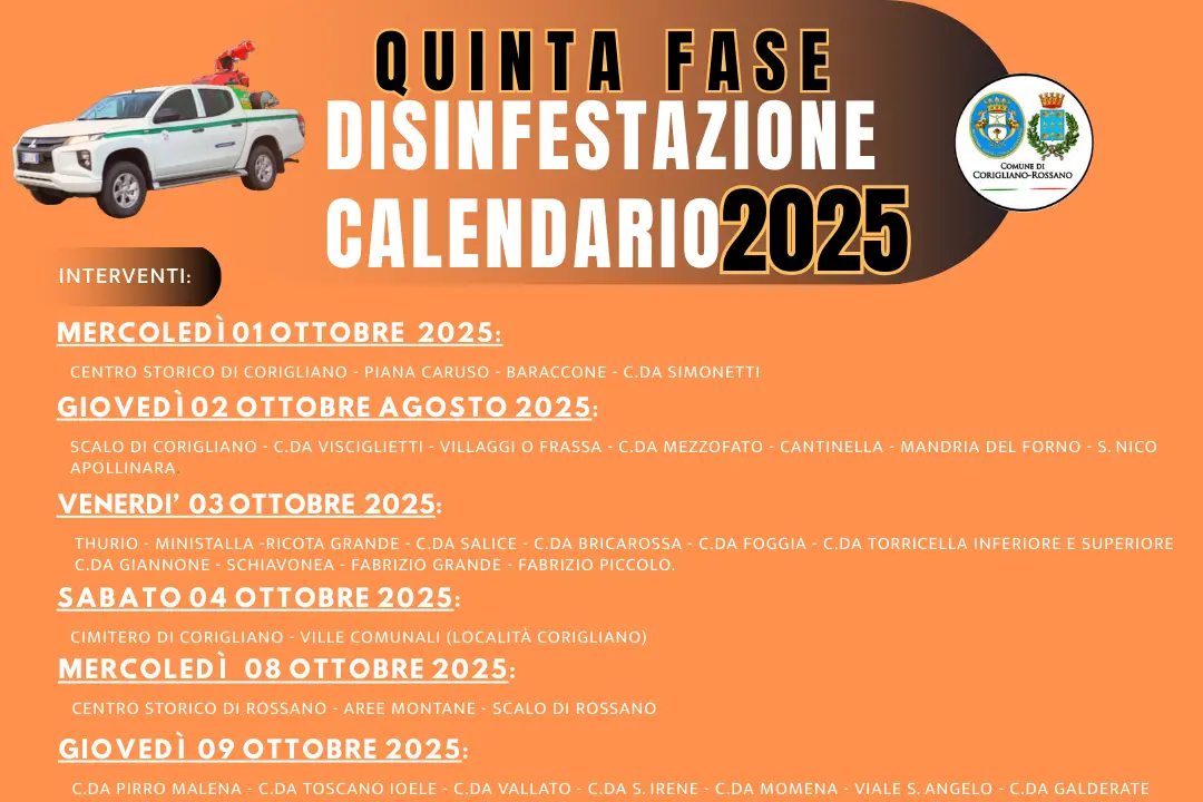 Dal 1° ottobre 2025 prenderà avvio la quinta fase della disinfestazione notturna a Corigliano-Rossano, a cura della società Ecoross. Gli interventi si svolgeranno tra le 2:00 e le 6:00 del mattino e prevedono la nebulizzazione di prodotti insetticidi contro zanzare, mosche e insetti volanti.
