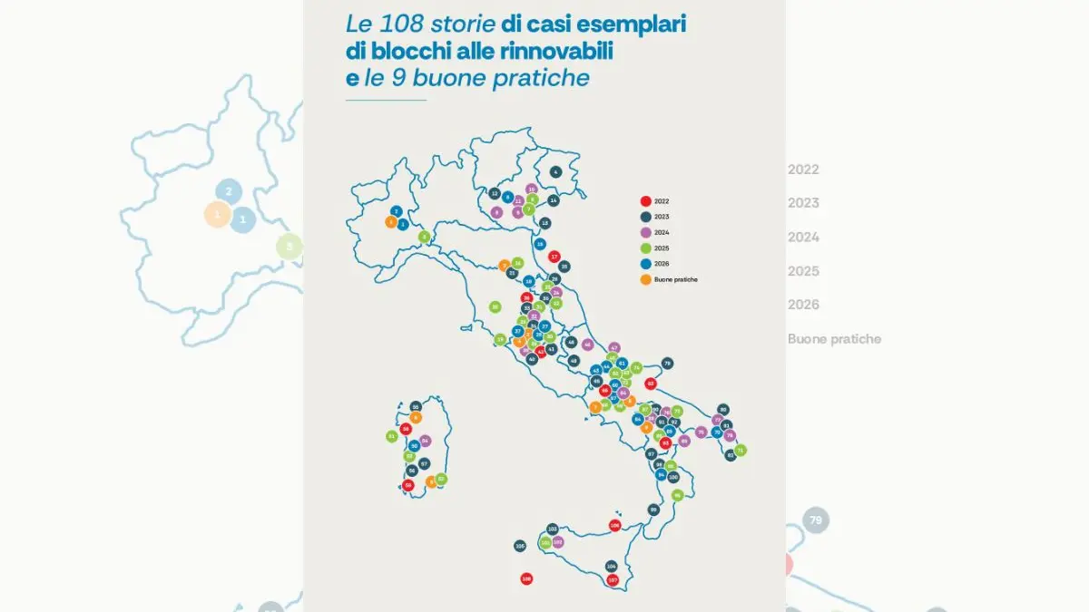 Il report passa poi ai blocchi “sul campo”: su 108 storie mappate negli anni, 18 vengono indicate come censite nel 2026, con la Puglia citata come regione con più casi. Tra gli esempi riportati ci sono un progetto eolico da 23 MW ad Ariano Irpino bocciato per vincoli archeologici, l’offshore a largo di Ravenna con VIA positiva e permessi già ottenuti ma ancora fermo per assenza di un quadro regolatorio adeguato, e un caso a Terni dove il fotovoltaico sui tetti sarebbe stato negato per motivazioni estetiche.