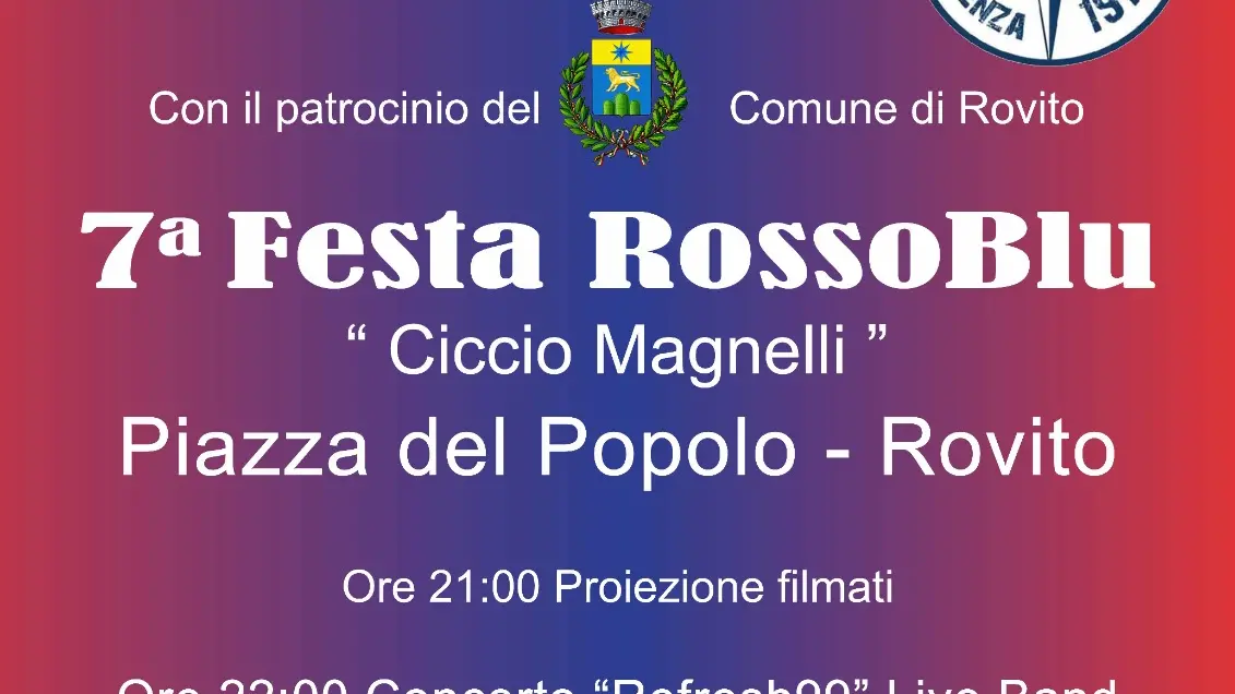 Il Club rossoblù “Ciccio Magnelli” di Rovito organizza la tradizionale festa rossoblù che si terrà martedì 2 settembre in piazza del Popolo. La serata sarà arricchita dall’esposizione delle magliette dei lupi degli anni ’80 e ’90 indossate da tanti campioni tra i quali Marulla, Bergamini, Catena e dalla musica del gruppo Refresh99 live band.