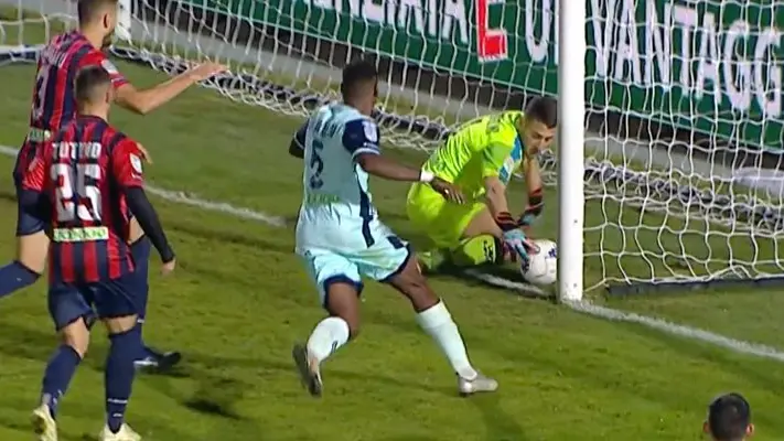 Al 44′ della ripresa il portiere del Cosenza interviene goffamente su un colpo di testa di Crecco. Per il signor Guccini di Albano Laziale la palla ha varcato la linea bianca. Queste le immagini al rallenty diffuse dalla Rai. P