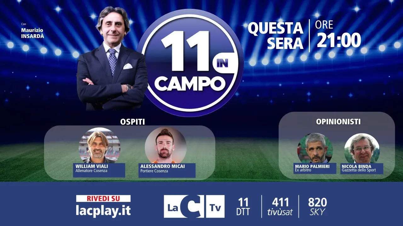 Si rinnova l’appuntamento settimanale con “11 in campo”, la trasmissione calcistica che racconta la stagione sportiva della serie B e C. Il format di LaC è ideato e condotto da Maurizio Insardà, con la partecipazione di Nicola Binda Gazzetta dello sport e Mario Palmieri ex arbitro di serie A.