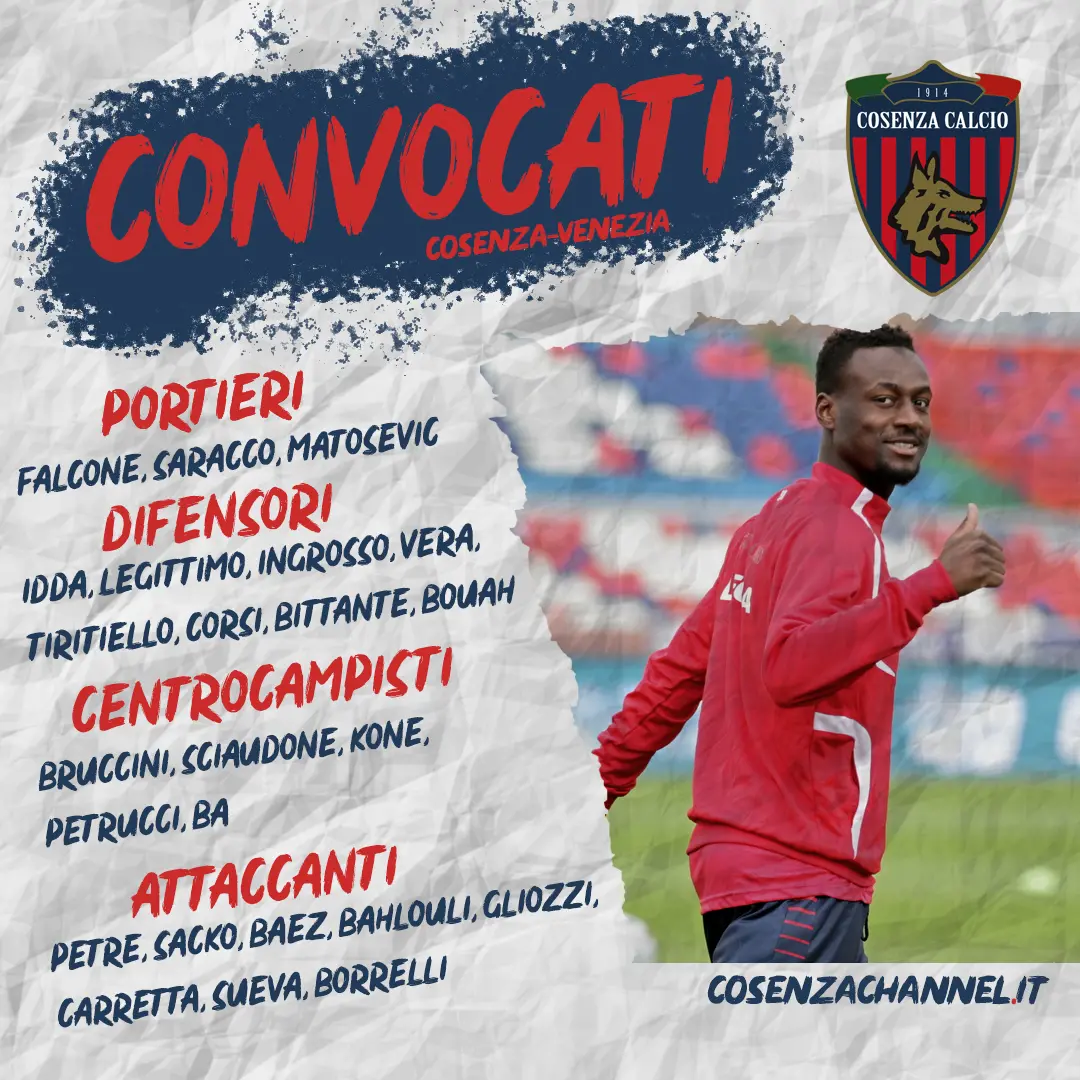 Sono 24 i calciatori convocati da Roberto Occhiuzzi per il match di domani sera Cosenza-Venezia. Nella lista diramata alla stampa non figura il nome di Raffaele Schiavi, finito ko prima del match di Ascoli. Torna invece Carretta che ha smaltito l’affaticamento muscolare. In tribuna dovrebbe finire il terzo portiere Matosevic.