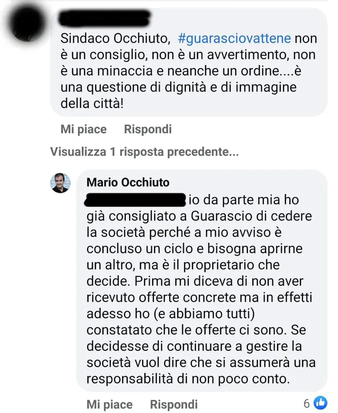 «Sindaco Occhiuto – scrive il tifoso – #guarasciovattene non è un consiglio, non è un avvertimento, non è una minaccia e neanche un ordine, è una questione di dignità e di immagine della città!». Non è tardata ad arrivare la replica del primo cittadino che palese la sua posizione, ormai abbastanza netta. «Io, da parte mia, ho già consigliato a Guarascio di cedere la società. A mio avviso, è concluso un ciclo e bisogna aprirne un altro, ma è il proprietario che decide. Prima mi diceva di non aver ricevuto offerte concrete ma in effetti adesso ho (e abbiamo tutti) constatato che le offerte ci sono. Se decidesse di continuare a gestire la società vuol dire che si assumerà una responsabilità di non poco conto».
