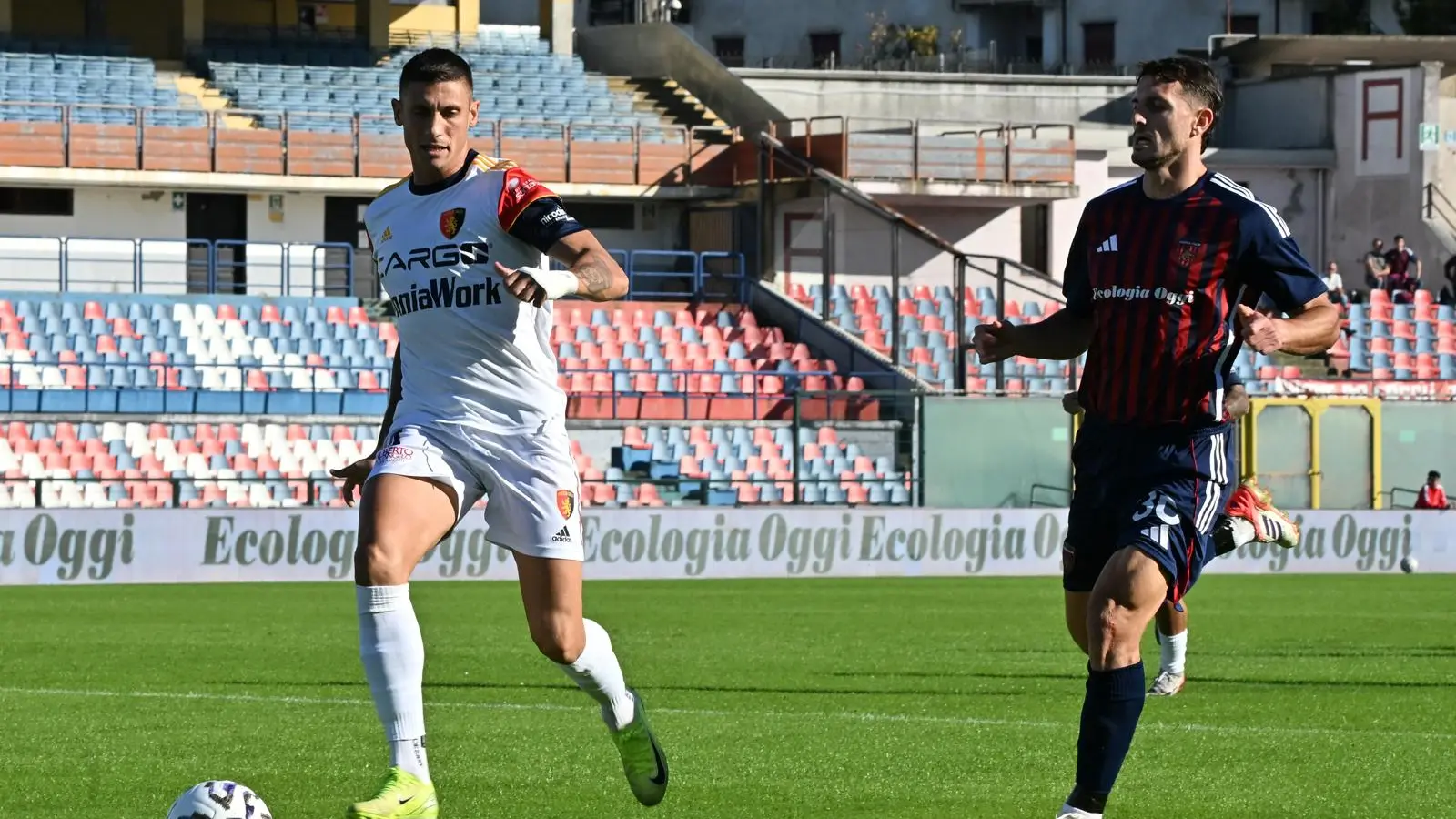 Il Cosenza pende a destra. Lui mantiene bene la posizione, non rischia nulla e quando può si spinge in avanti.
