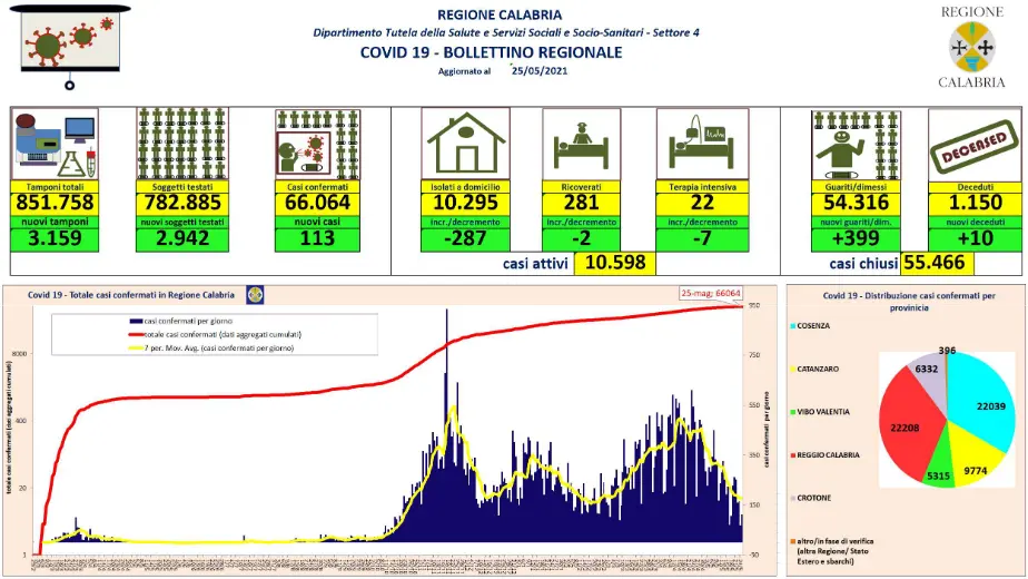Nel conteggio sono compresi anche i due pazienti di Bergamo trasferiti a Catanzaro, mentre non sono compresi i numeri del contagio pervenuti dopo la comunicazione dei dati alla Protezione Civile. L’Asp di Crotone comunica un decesso avvenuto il 15/05/2021.