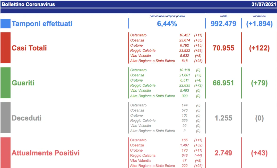 - Reggio Calabria: CASI ATTIVI 648 (23 in reparto, 1 in terapia intensiva, 624 in isolamento domiciliare); CASI CHIUSI 23.174 (22.835 guariti, 339 deceduti).