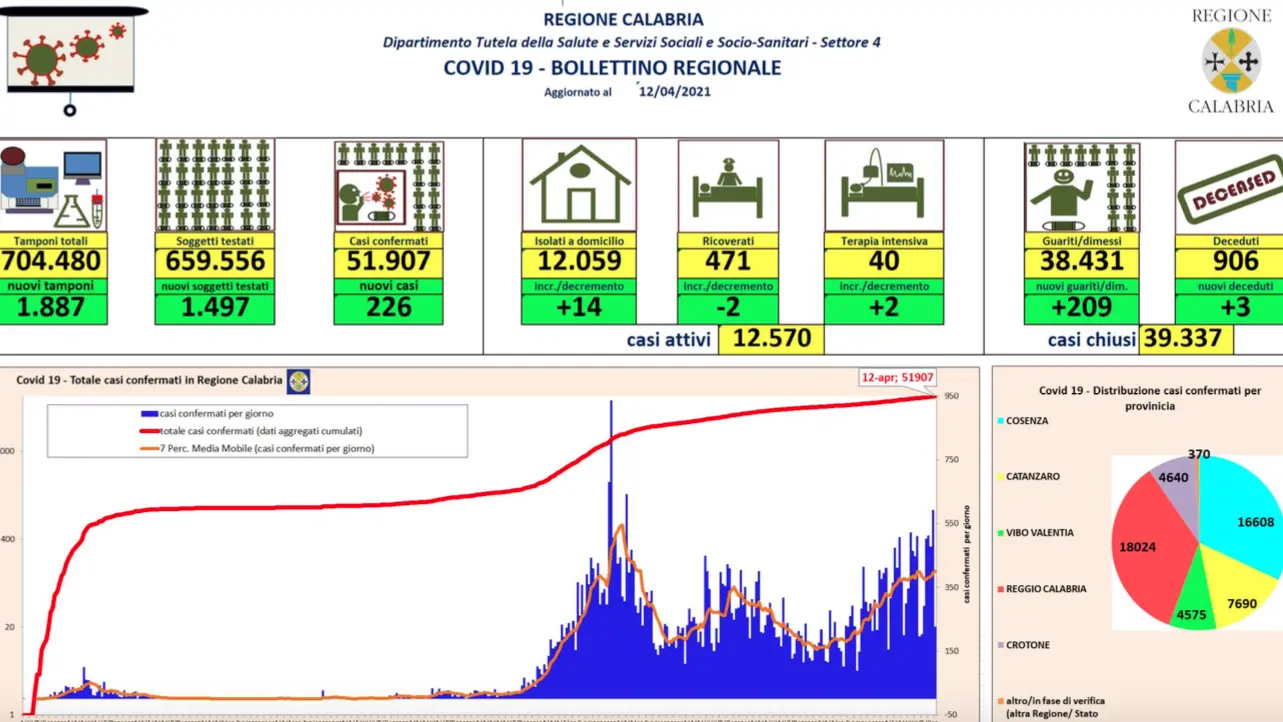 Nel bollettino della Calabria si contano 226 nuovi contagi su 1887 tamponi effettuati nelle ultime 24 ore. Oggi si registrano 3 decessi.