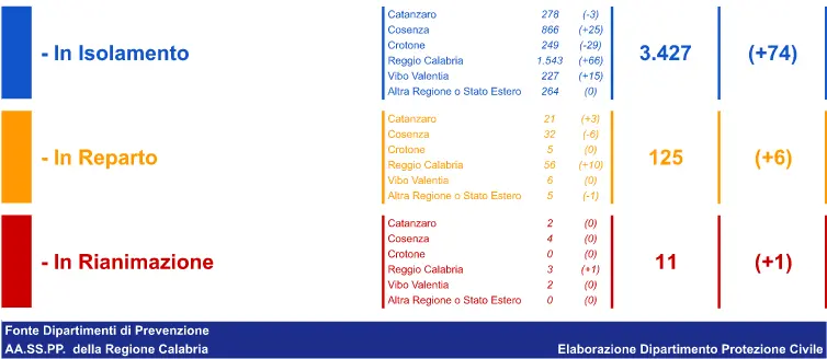- Reggio Calabria: CASI ATTIVI 1.602 (56 in reparto, 3 in terapia intensiva, 1.543 in isolamento domiciliare); CASI CHIUSI 23.807 (23.459 guariti, 348 deceduti);