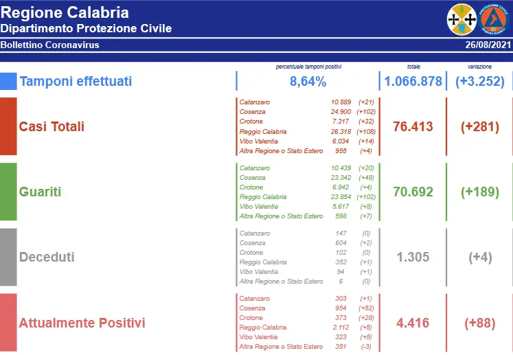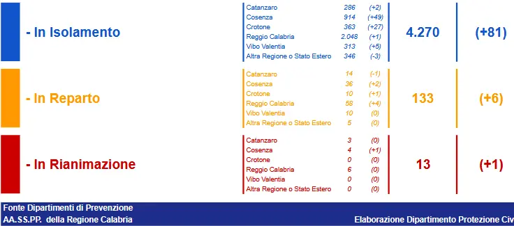 - Reggio Calabria: CASI ATTIVI 2112 (58 in reparto, 6 in terapia intensiva, 2048 in isolamento domiciliare); CASI CHIUSI 24.206 (23.854 guariti, 352 deceduti);