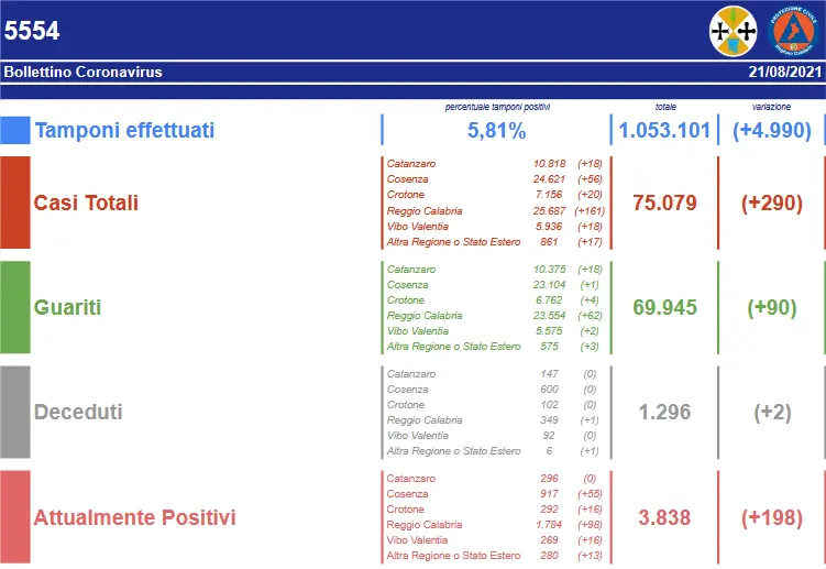 - Reggio Calabria: CASI ATTIVI 1.784 (54 in reparto, 4 in terapia intensiva, 1.726 in isolamento domiciliare); CASI CHIUSI 23.903 (23.554 guariti, 349 deceduti);