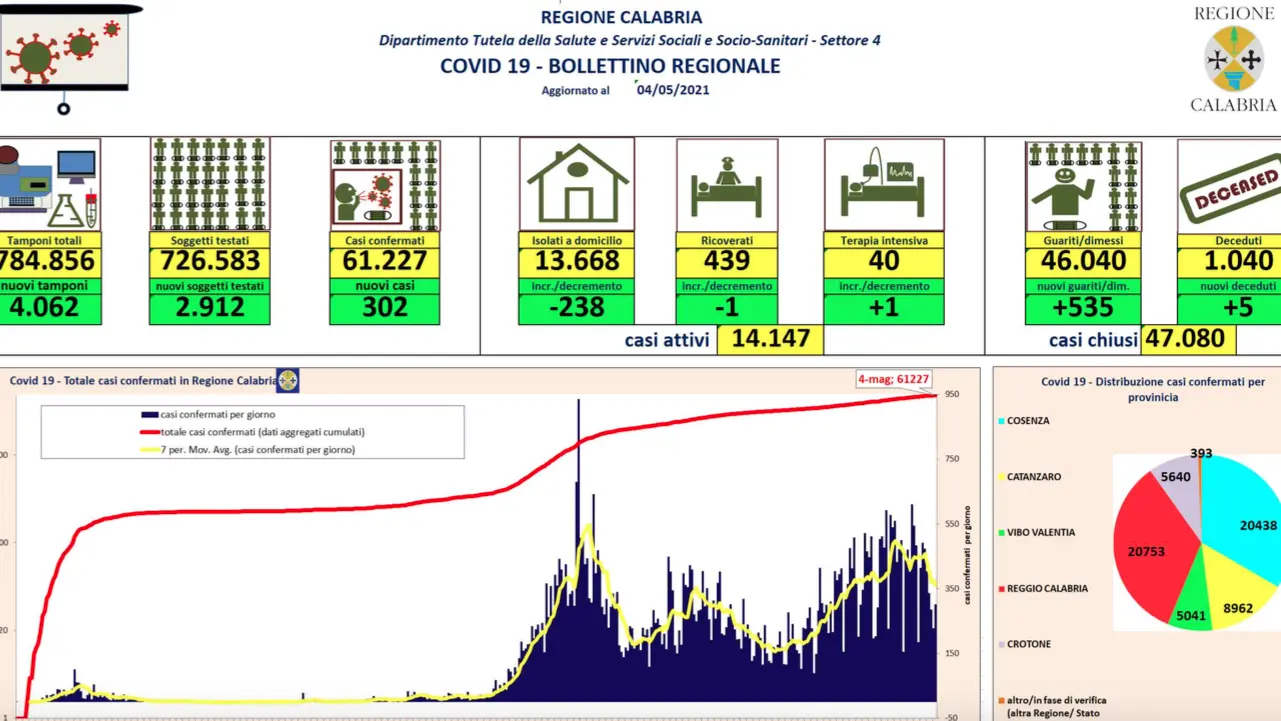 Nel bollettino di oggi si contano 302 nuovi contagi in Calabria, 535 guariti e 5 decessi. Il tasso di positività è pari al 7,43 per cento.