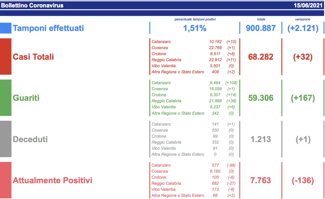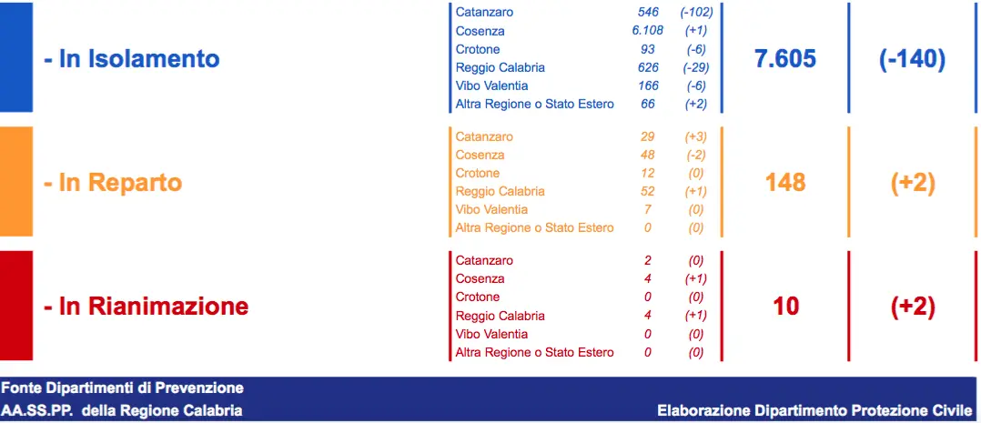 - Reggio Calabria: CASI ATTIVI 682 (52 in reparto, 4 in terapia intensiva, 626 in isolamento domiciliare); CASI CHIUSI 22230 (21898 guariti, 332 deceduti)