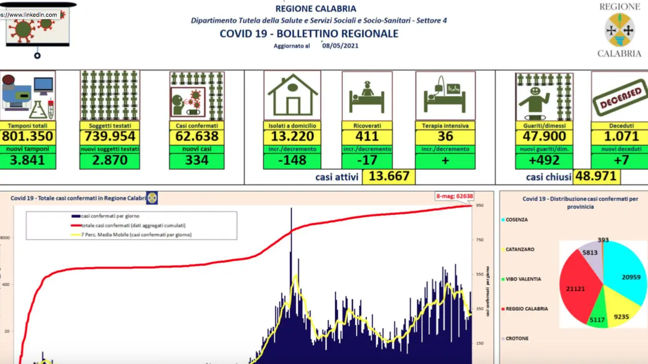 - Cosenza: CASI ATTIVI 7.267 (107 in reparto AO di Cosenza; 34 in reparto al presidio di Rossano; 4 in terapia intensiva al presidio di Rossano; 16 al presidio ospedaliero di Acri; 15 al presidio ospedaliero di Cetraro; 0 all’ospedale da Campo; 14 in terapia intensiva, 7.077 in isolamento domiciliare); CASI CHIUSI 13.692 (13.210 guariti, 482 deceduti).