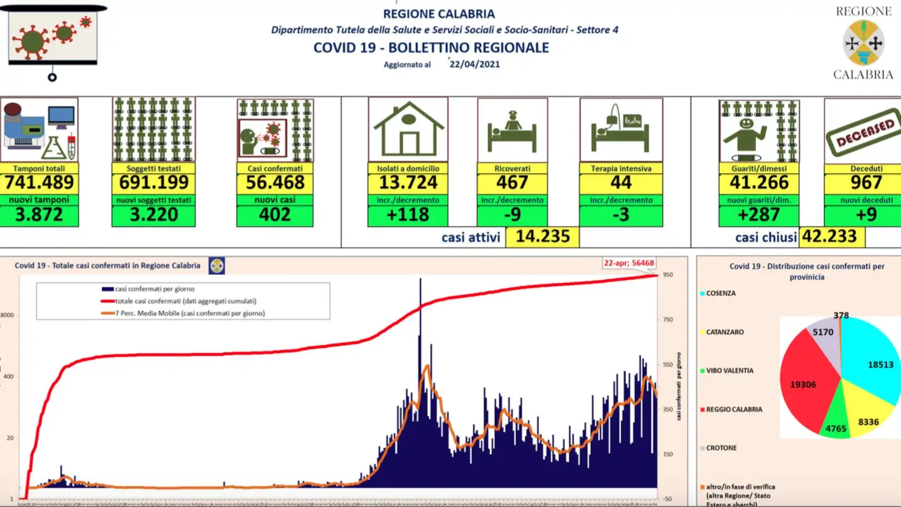 - Vibo Valentia: CASI ATTIVI 399 (16 ricoverati, 383 in isolamento domiciliare); CASI CHIUSI 4.366 (4289 guariti, 77 deceduti).