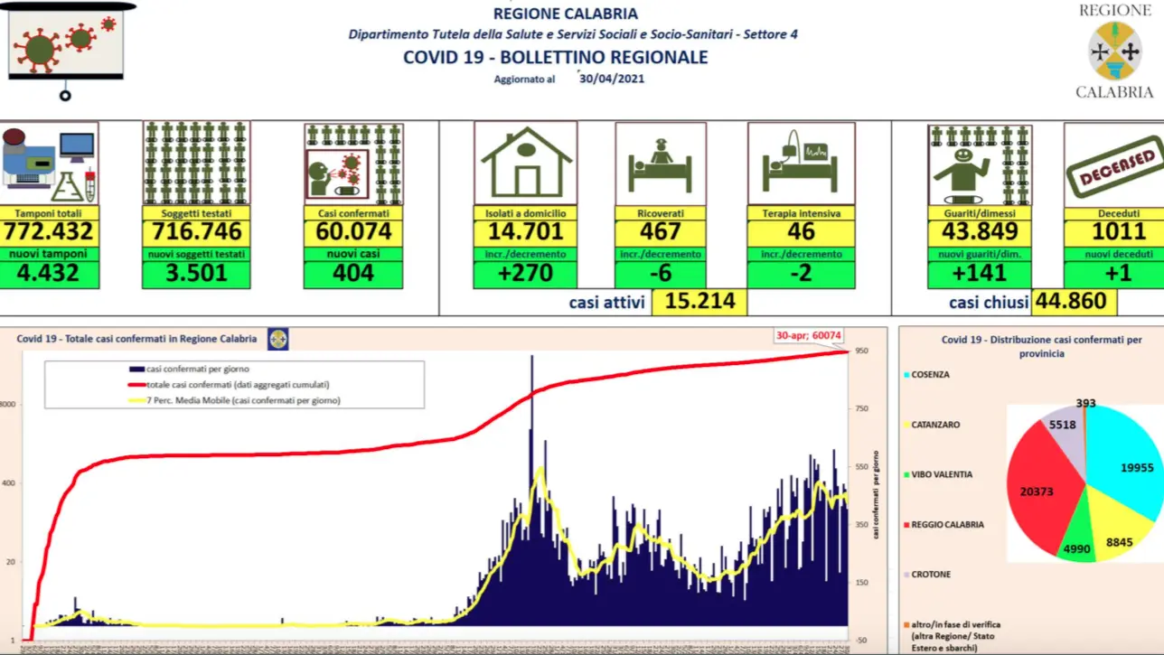 - Vibo Valentia: CASI ATTIVI 459 (20 ricoverati, 439 in isolamento domiciliare); CASI CHIUSI 4.531 (4.451 guariti, 80 deceduti).