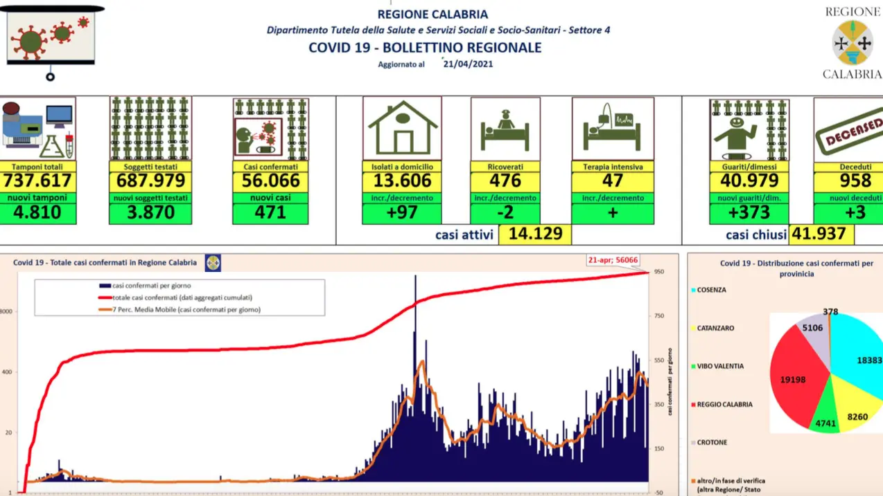 Nel bollettino di oggi della Regione Calabria si contano 471 contagi, 3 decessi e 373 guariti. Il tasso di positività odierno è pari al 9,79%