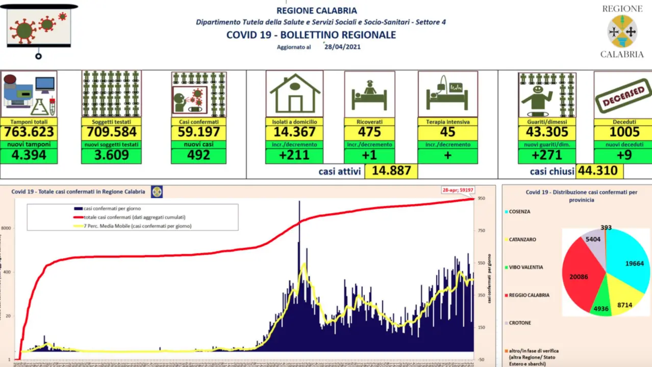 - Crotone: CASI ATTIVI 916 (43 in reparto; 873 in isolamento domiciliare); CASI CHIUSI 4.488 (4.414 guariti, 74 deceduti).
