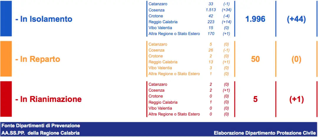 - Reggio Calabria: CASI ATTIVI 237 (13 in reparto, 1 in terapia intensiva, 223 in isolamento domiciliare); CASI CHIUSI 23.079 (22741 guariti, 338 deceduti);