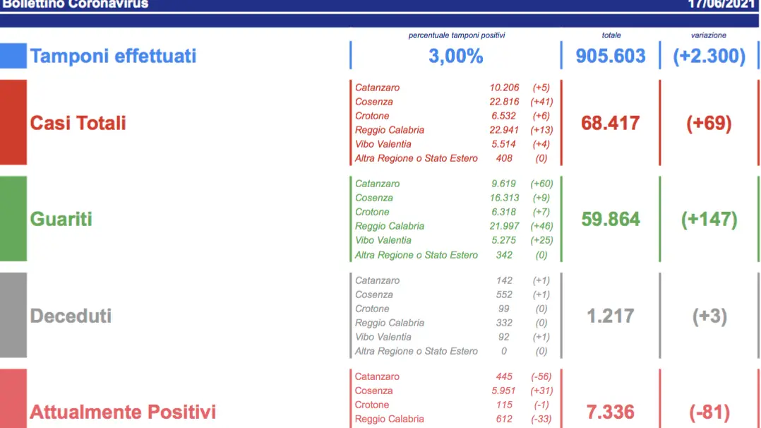 - Vibo Valentia: CASI ATTIVI 147 (4 in reparto, 0 in terapia intensiva, 143 in isolamento domiciliare); CASI CHIUSI 5367 (5275 guariti, 92 deceduti).