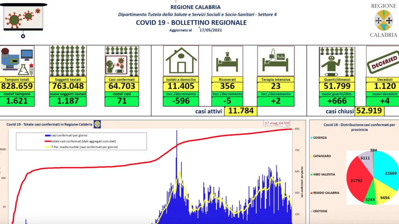 - Crotone: CASI ATTIVI 710 (24 in reparto; 686 in isolamento domiciliare); CASI CHIUSI 5.401 (5.313 guariti, 88 deceduti).