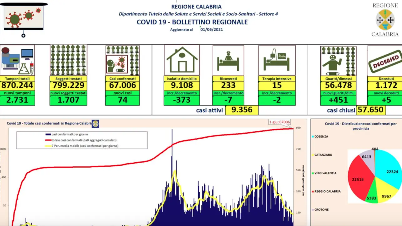 - Catanzaro: CASI ATTIVI 1.091 (25 in reparto all’Azienda ospedaliera di Catanzaro; 6 in reparto al presidio di Lamezia Terme; 7 in reparto all’Azienda ospedaliera universitaria Mater Domini; 4 in terapia intensiva; 1049 in isolamento domiciliare); CASI CHIUSI 8.876 (8.738 guariti, 138 deceduti).
