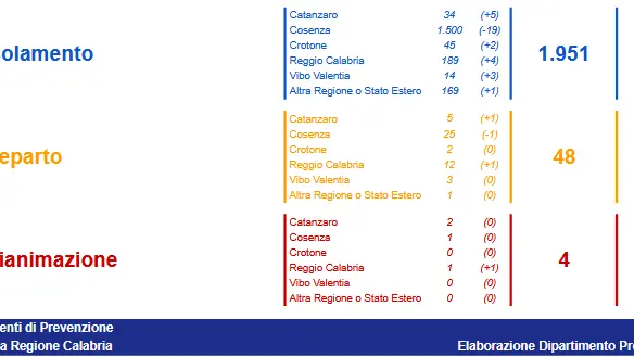 - Catanzaro: CASI ATTIVI 41 (5 in reparto, 2 in terapia intensiva, 34 in isolamento domiciliare); CASI CHIUSI 10231 (10087 guariti, 144 deceduti);
