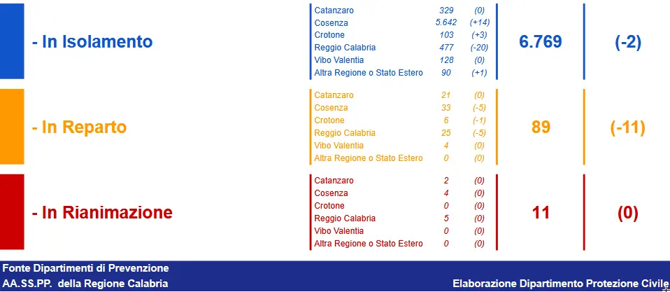 - Catanzaro: CASI ATTIVI 445 (25 in reparto, 2 in terapia intensiva, 418 in isolamento domiciliare); CASI CHIUSI 9761 (9619 guariti, 142 deceduti)