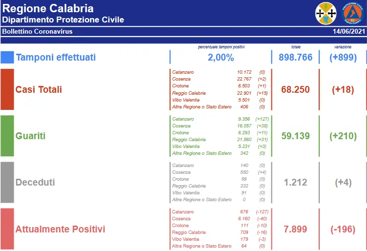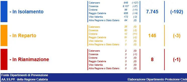 - Reggio Calabria: CASI ATTIVI 709 (51 in reparto, 3 in terapia intensiva, 655 in isolamento domiciliare); CASI CHIUSI 22.192 (21.860 guariti, 332 deceduti).