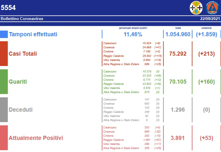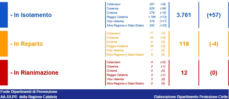 - Reggio Calabria: CASI ATTIVI 1.851 (49 in reparto, 3 in terapia intensiva, 1.799 in isolamento domiciliare); CASI CHIUSI 23.951 (23.602 guariti, 349 deceduti);