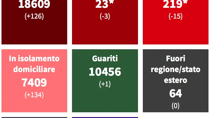 Inoltre, in isolamento domiciliare ci sono 134 positivi in più rispetto a ieri, mentre oggi si conta soltanto un guarito. Infine, il tasso di positività odierno è pari al 18,9% su 665 tamponi effettuati nelle ultime 24 ore.