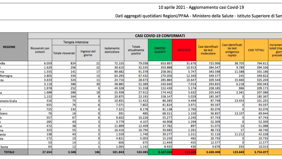 Sono 17.567 i contagi da coronavirus in Italia oggi, 10 aprile, secondo i dati Regione per Regione nel bollettino fornito dal ministero della Salute, e 344 i morti. Sono 320.892 i tamponi processati, tra molecolari e antigenici, in 24 ore che hanno fatto registrare un tasso di positività pari al 5,4%. Dall’inizio dell’emergenza sono state contagiate dal covid-19 3.754.077 persone mentre ne sono morte 113.923.