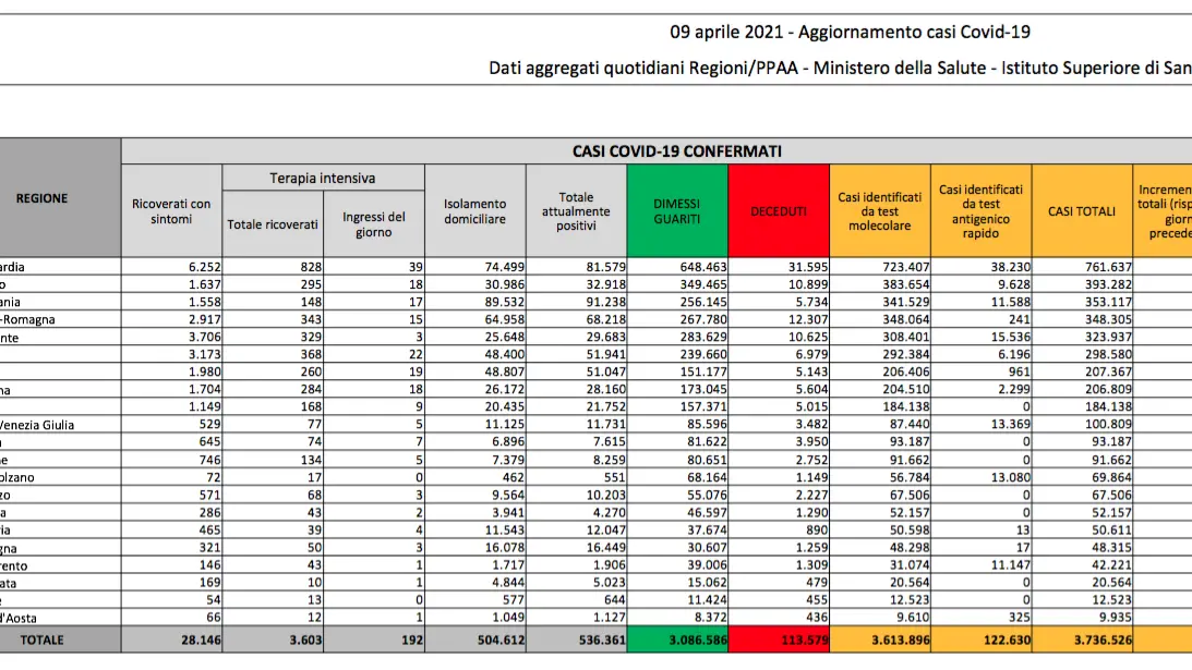 Sono 18.938 i contagi da coronavirus in Italia oggi, 9 aprile, secondo i dati Regione per Regione nel bollettino della Protezione Civile. Da ieri, registrati altri 718 morti. Da ieri eseguiti 362.973 tamponi, l’indice positività è al 5,2%. I pazienti ricoverati in terapia intensiva sono 3.603 (-60 da ieri), 192 nuovi ingressi oggi.