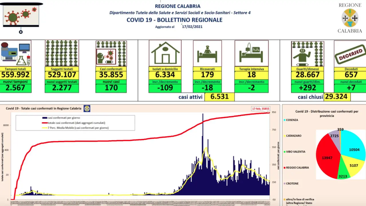 - Vibo Valentia: CASI ATTIVI 389 (9 ricoverati, 380 in isolamento domiciliare); CASI CHIUSI 2824 (2773 guariti, 51 deceduti).