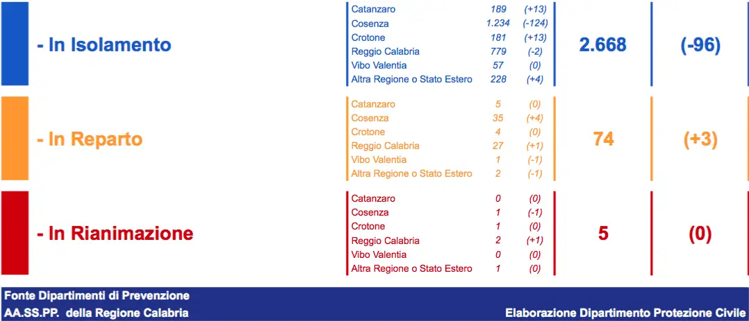 - Cosenza: CASI ATTIVI 1.270 (35 in reparto, 1 in terapia intensiva, 1234 in isolamento domiciliare); CASI CHIUSI 22.524 (21945 guariti, 579 deceduti).