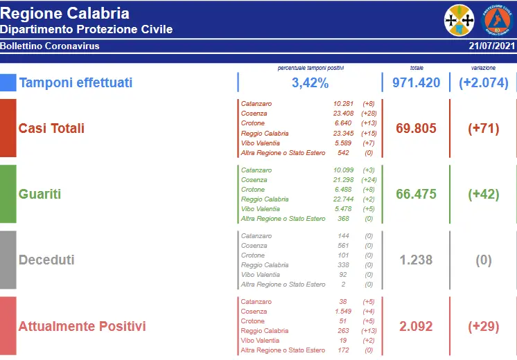 In Calabria, ad oggi, il totale dei tamponi eseguiti sono stati 971.420 (+2.074).