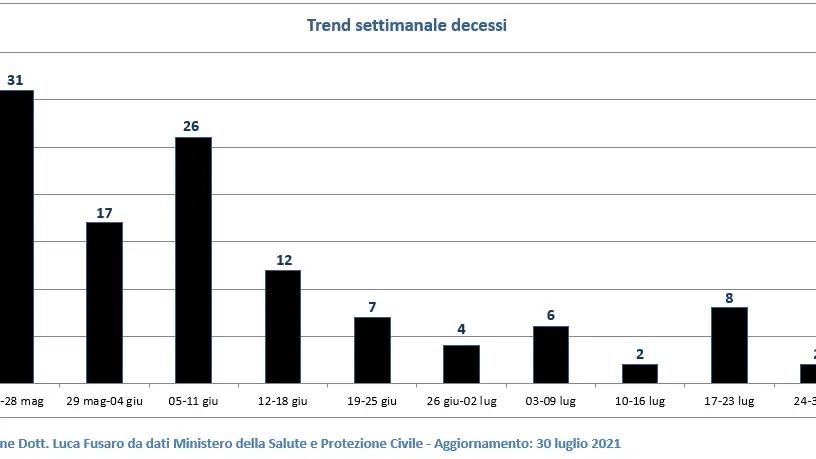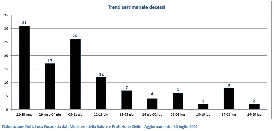 Il numero dei decessi scende da 8 a 2 (-75%). Nel bollettino del 26 luglio la regione Calabria comunica che i 9 decessi registrati in data odierna sono relativi a periodi pregressi (dic. 2020 e primi mesi 2021), quindi ho sottratto tale numero dal totale dei decessi settimanali.