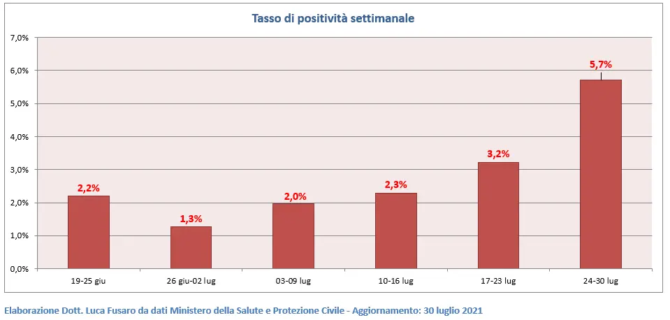 Il tasso di positività è un indicatore della diffusione di una epidemia. Viene definito come il rapporto tra il numero di positivi rispetto ai tamponi effettuati. Un’altra possibile definizione considera i “casi testati” al posto dei tamponi. La ragione di questa definizione alternativa è dovuta al fatto che il numero di tamponi include anche quelli di controllo effettuati per accertare la guarigione di un soggetto positivo. Il tasso di positività, calcolato sui tamponi, passa da 3,2% a 5,7%.