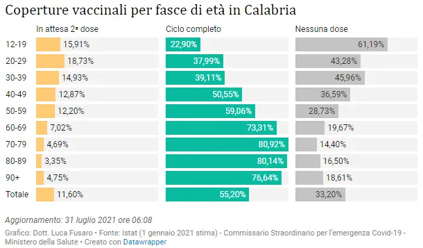 Al 31 luglio (aggiornamento ore 06:08), l’11,6% della popolazione over 12 è in attesa della 2ᵃ dose (n. 195.848), il 55,2% ha completato il ciclo vaccinale (n. 932.114), il 33,2% non ha ricevuto alcuna dose (n. 560.655), il 66,8% ha ricevuto almeno una dose di vaccino (n. 1.127.962).