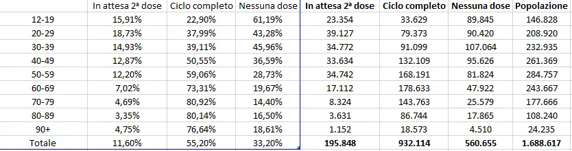 Nota metodologica: nel calcolo delle percentuali dei vaccinati utilizzo come dato non l’intera popolazione regionale ma la platea interessata ossia i soggetti ≥ 12 anni che secondo la stima dell’Istat sulla popolazione residente al 1° gennaio 2021 è pari a 1.688.617.