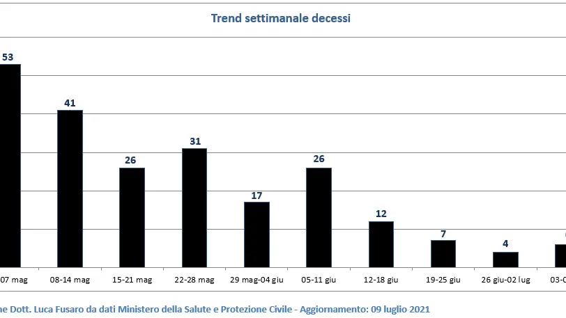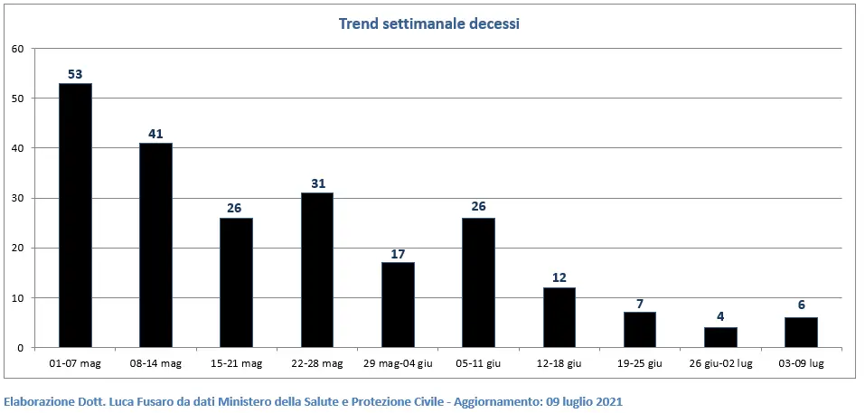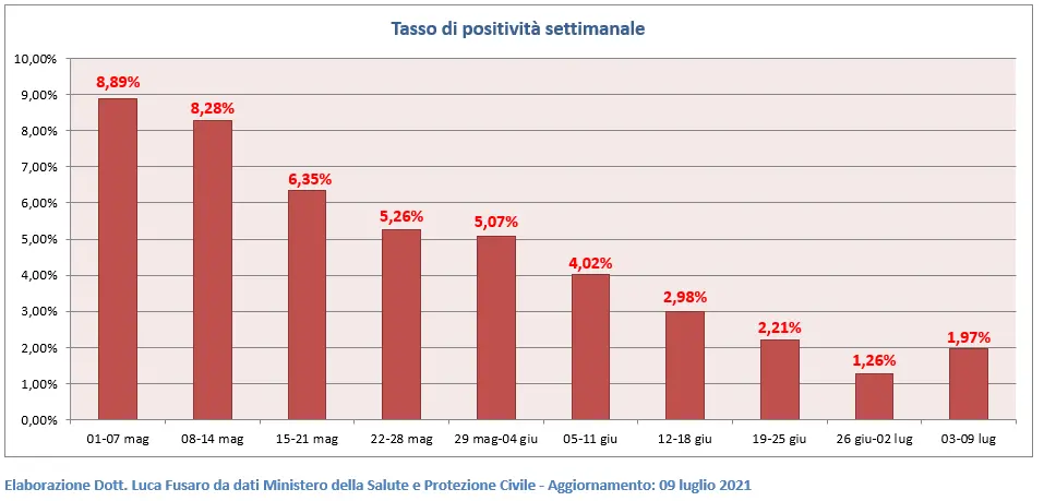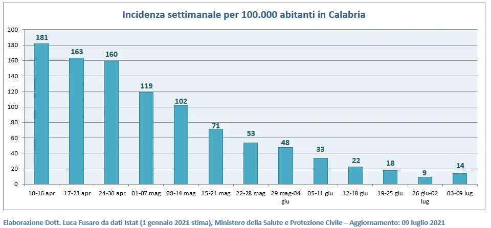 Monitoraggio settimanale dell’epidemia da Covid-19 in Calabria a cura di Luca Fusaro: dati aggiornati al 9 luglio 2021 ore 17 (dati monitoraggio epidemia) e al 10 luglio 2021 ore 06:10 (dati vaccini). Il monitoraggio di Luca Fusaro rileva, nella settimana 03-09 luglio 2021, un incremento del 51,2% dei nuovi casi rispetto alla settimana precedente, dopo 11 settimane consecutive di discesa.