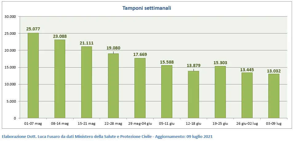 Il numero dei tamponi settimanali passa da 13.445 a 13.032 (-3,1%), in media 1.862 al giorno.