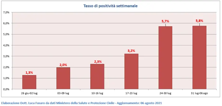 Monitoraggio settimanale dell’epidemia da Covid-19 in Calabria a cura del Dott. Luca Fusaro: dati aggiornati al6 agosto 2021 ore 17:00 (dati monitoraggio epidemia) e al7 agosto 2021 ore 06:10 (dati vaccini). Il trend dei nuovi casi è in crescita per la 5ᵃ settimana consecutiva: 988 i contagi segnalati (+14,5%).